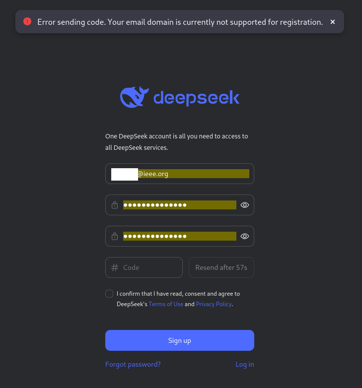 Intrigued by the reviews of the release, I tried their chat offering. I was asked to set up an account on chat.deepseek.com. I used my default email ID (that of @ieee.org) but it refused to let me register, saying that domain is not supported! That’s quite a claim. Why was it a problem, I have no idea.