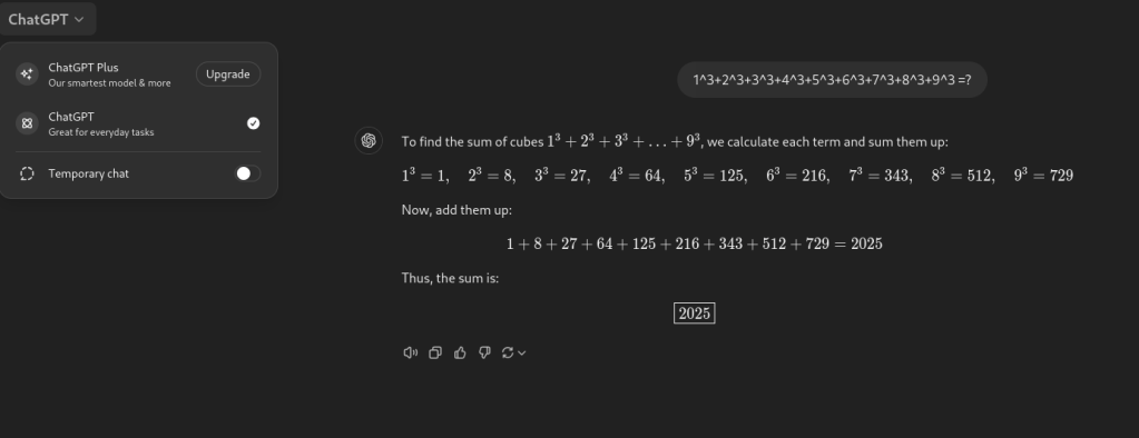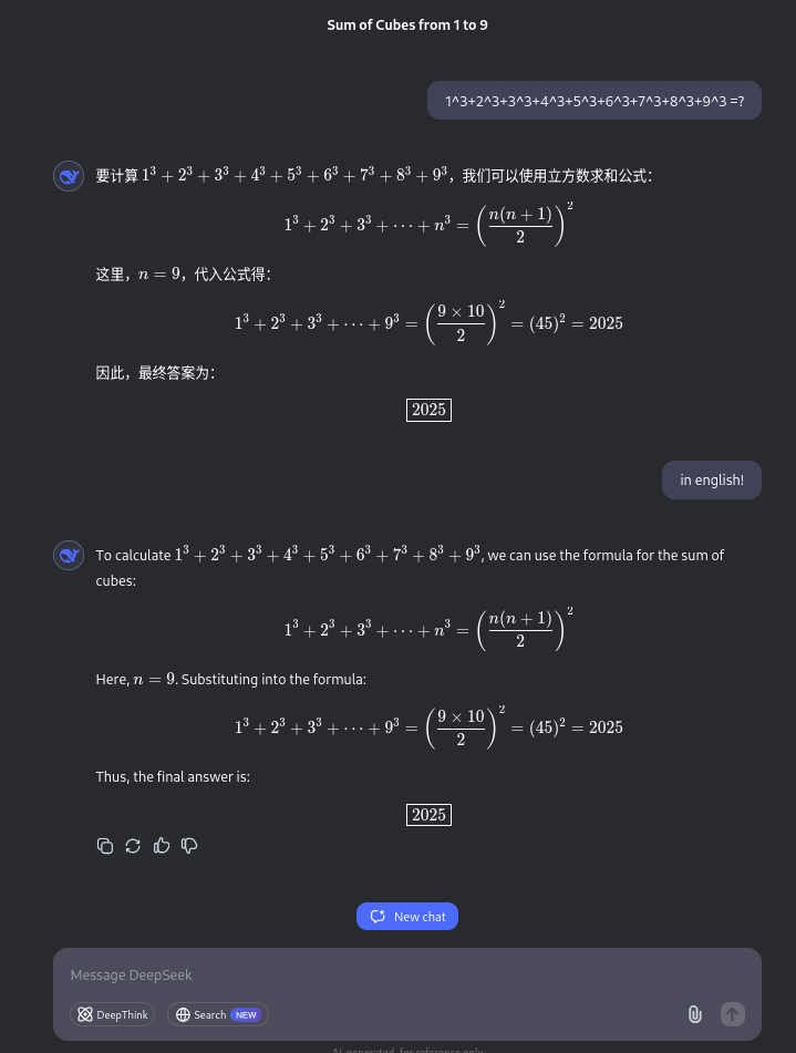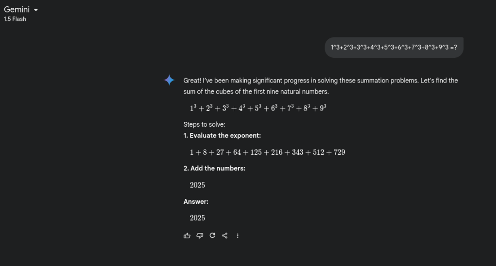 I loved how it replied to this prompt: “1^3+2^3+3^3+4^3+5^3+6^3+7^3+8^3+9^3 =?”. It came back in Chinese (hmm) and when asked to respond in English, it was beautiful to watch it construct the equations. It provided me the formula for computing the sum of cubes, wonderful.