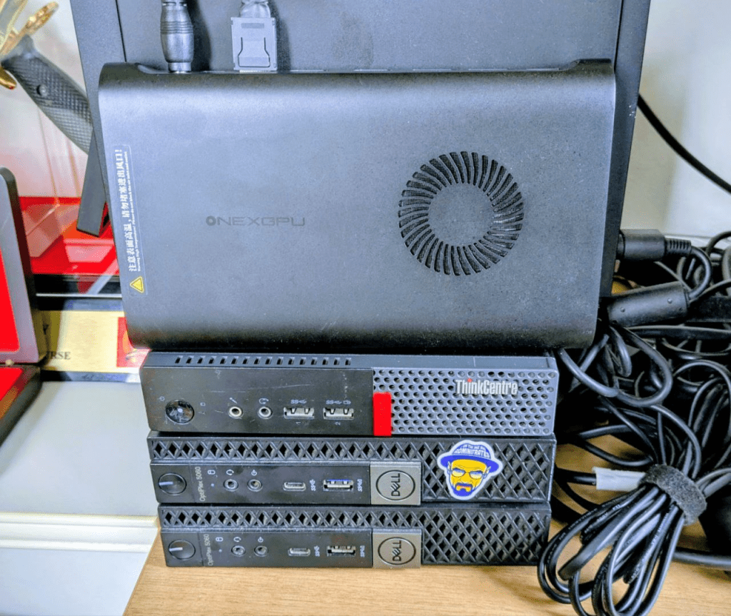 All of my systems are 2nd-hand small form factor systems. The ones I have are two Dell Optiplex and two Lenovo ThinkCentre systems. They have 64GB RAM (the maximum possible) and 1TB storage each. None of them have any GPUs on board and for that I’ve the ONEXGPU external egpu that connects to one of the Dells via a PCI-E <-> Oculink cable.