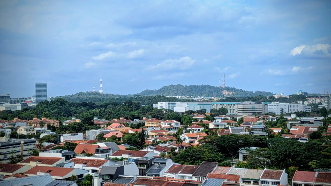 Bt Gombak (blocked by the tall building on the left), Bt Batok – where the two transmitting towers are, and Bt Timah, to the right – also where two transmitting towers are). Bt Timah happens to be the tallest land point in Singapore at 164m.